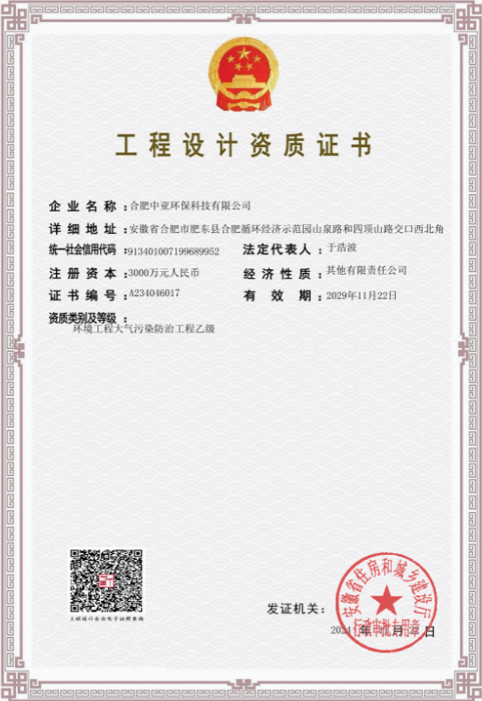 時間:2024-12-31 | 瀏覽:519近日,合肥91视频网址入口環保科技有限(xiàn)公司順利通過“大氣汙染防治(zhì)工(gōng)程乙級”工程設計資質(zhì)證書延期,標誌著91视频网址入口環保在大氣汙(wū)染防治領域的技術實力和服務水平再次得到了權威(wēi)機構(gòu)的認可(kě)。